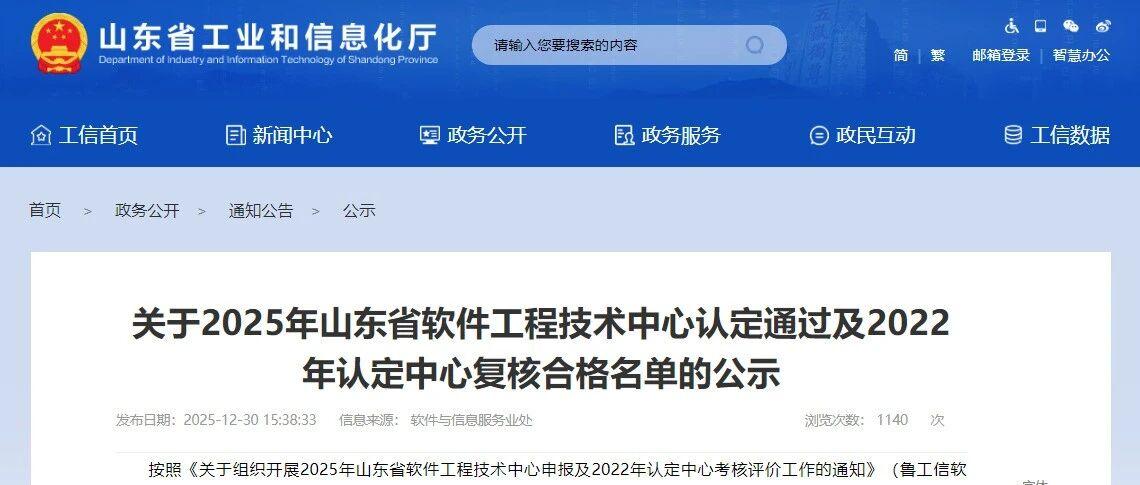 近日,山东省工业和信息化厅公布了2025年山东省软件工程技术中心认定通过及2022年认定中心复核合格名单。...