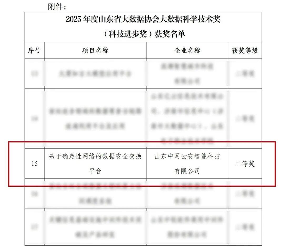 近日,山东省大数据协会正式公布了2025年度山东省大数据协会大数据科学技术奖获奖名单。经过层层严格评审,山东中网云安智能科技有限公司(以下简称“中网云安”)自主研发的 “基于确定性网络的数据安全交换平台” ,凭借其前瞻性的技术架构与卓越的应用价值,在众多优秀项目中脱颖而出,成功斩获“科技进步奖二等奖”!