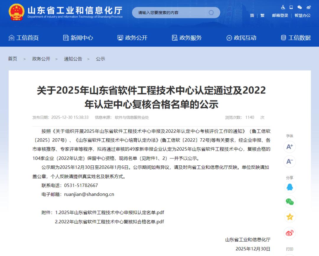 近日,山东省工业和信息化厅公布了2025年山东省软件工程技术中心认定通过及2022年认定中心复核合格名单。山东中网云安智能科技有限公司凭借卓越的技术研发实力、持续的创新能力和完善的软硬件支撑体系,顺利通过复核,再次荣获“山东省软件工程技术中心”称号!这是对中网云安在网络安全与信创领域持续深耕的高度认可,更是公司技术实力与研发体系持续优化的有力证明。