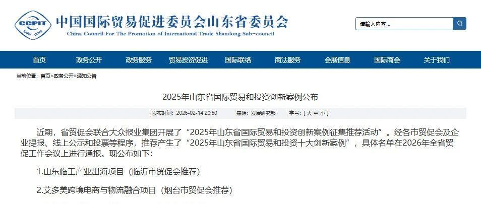 近日,由中国国际贸易促进委员会山东省委员会联合大众报业集团共同发起的“2025年山东省国际贸易和投资创新案例征集推荐活动”结果正式揭晓...