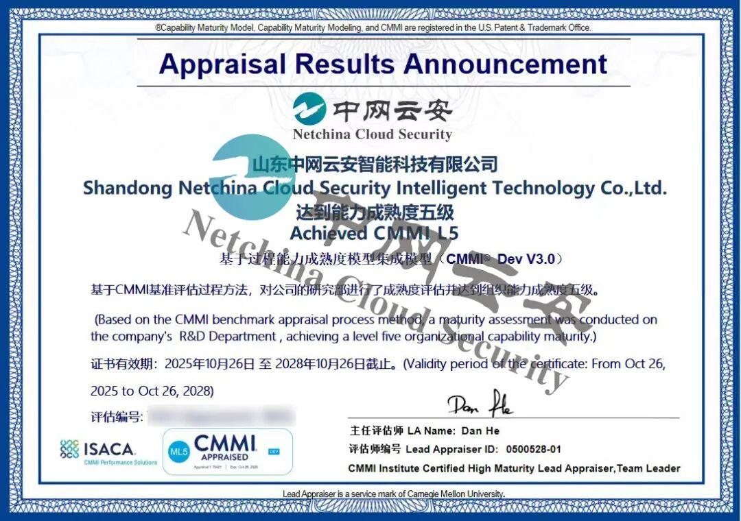 捷报传来,征程再续! 近日,经过严格的审核与评估,山东中网云安智能科技有限公司(以下简称“中网云安”)成功再次通过CMMI L5级(能力成熟度模型集成最高等级) 认证。这标志着公司在软件研发能力、项目管理能力、过程组织能力和方案交付能力等方面持续保持国际最高水平,是公司追求卓越、精益求精的又一有力见证。
